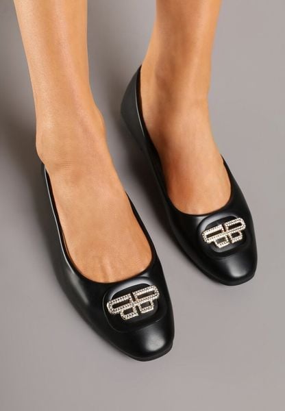 Czarne Płaskie Balerinki z Metalową Ozdobą z Cyrkoniami i Skórzaną Wkładką Tialara