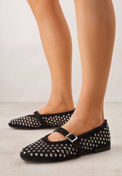 Czarne Ażurowe Balerinki z Paskiem z Klamerką i Cyrkoniami Feanoene