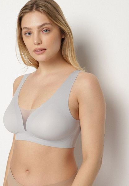 Szary Sportowy Biustonosz Zdobiony Siateczką i Gorsetową Aplikacją Salinalla