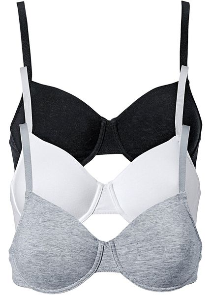 Wygodny biustonosz z miseczkami bezszwowymi. W komplecie 3 biustonosze na fiszbinach z kolekcji bpc bonprix collection. Miseczki bez watowania, modelowane bezszwowo. Należy prać ręcznie.