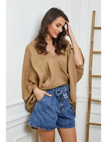 – czysty len- dekolt: V- dolny brzeg: asymetryczny- krój: oversized- look: jednokolorowy