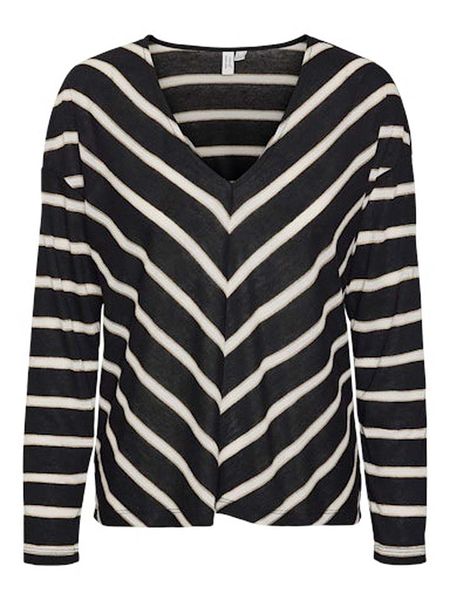 – z dodatkiem lnu- dekolt: V- detale: połyskująca nitka- krój: prosty- wzór: paski