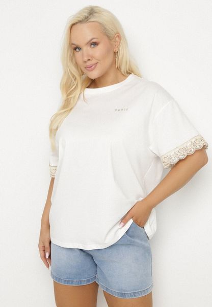 Biała Bawełniana Bluzka T-shirt z Krótkim Rękawem z Nadrukiem i Guzikami Fiomara