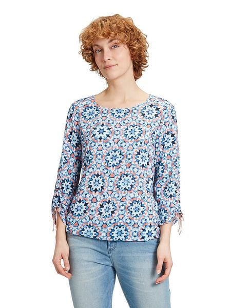 – czysta wiskoza- dekolt: okrągły- zakończenie rękawów: ściągacz tunelowy- długość rękawa: 7/8- krój: prosty- wzór: na całości