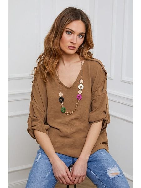 – dekolt: okrągły- detale: ozdobne guziki- zakończenie rękawów: patka i guzik- krój: luźny- look: jednokolorowy