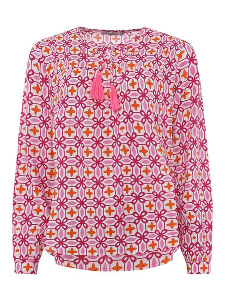 – czysta wiskoza- dekolt: z rozcięciem- zakończenie rękawów: mankiet na guzik- detale: ozdobne wiązanie- krój: prosty- wzór: na całości