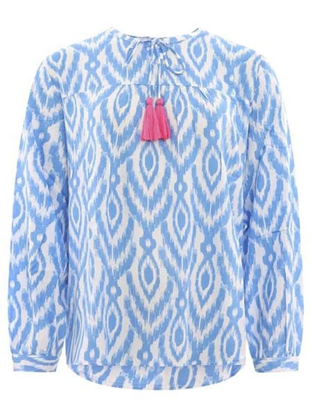 – czysta wiskoza- dekolt: okrągły- zakończenie rękawów: mankiet na guzik- detale: ozdobne wiązanie- krój: prosty- wzór: na całości