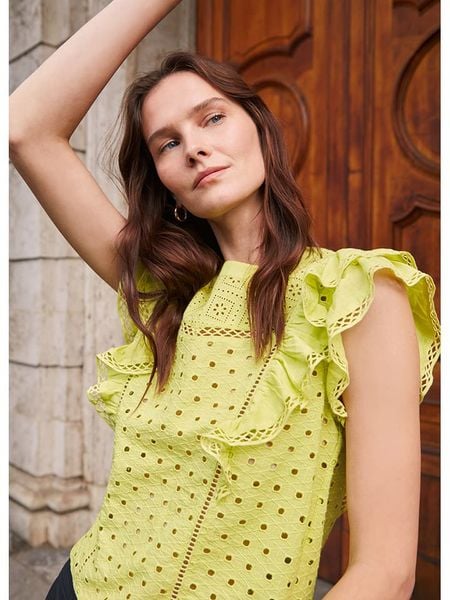 – czysta bawełna- dekolt: okrągły- zapięcie: guzik na plecach- detale: falbany- krój: prosty- wzór: dziurkowany