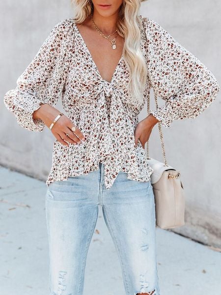 – dekolt: V- zakończenie rękawów: marszczenie- detale: ozdobny supełek- krój: luźny- wzór: kwiatowy