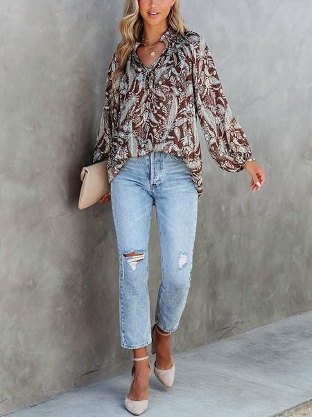 – dekolt: V- zakończenie rękawów: elastyczne- detale: ozdobne wiązanie- krój: luźny- wzór: orientalnyUwaga: Podczas wybierania odpowiedniego rozmiaru należy kierować się tabelą, widoczną na ostatnim zdjęciu.