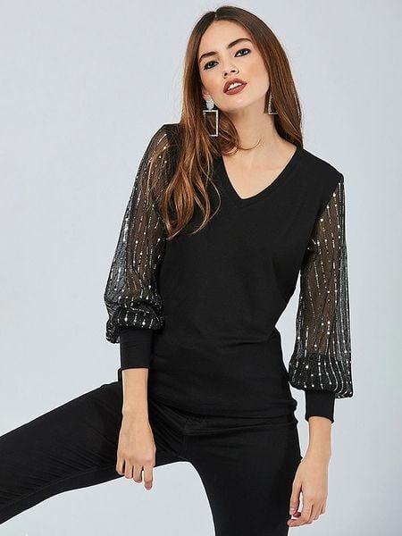 – dekolt: V- rękaw: bufiasty – detale: cekiny- krój: prosty- look: jednokolorowy- wykończenie: delikatnie prześwitująceUwaga: Podczas wybierania odpowiedniego rozmiaru należy kierować się tabelą, widoczną na ostatnim zdjęciu.