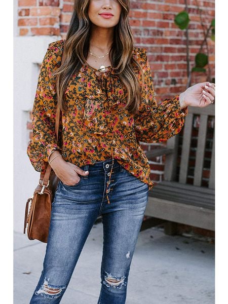 – dekolt: V- detale: ozdobne wiązanie- rękaw: bufiasty – krój: luźny- wzór: na całości