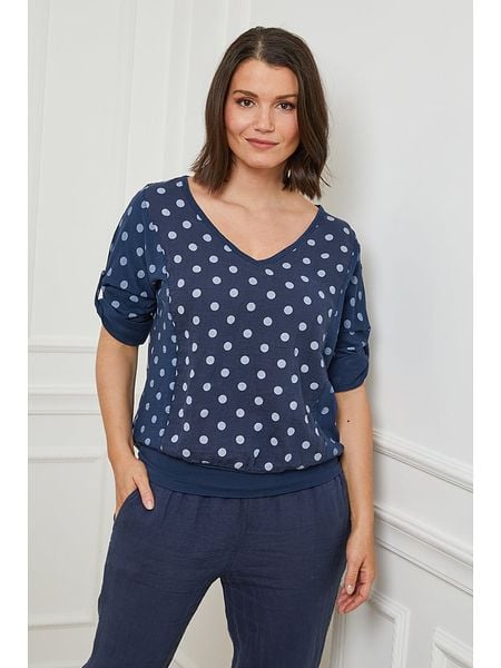 – czysty len- dekolt: V- zakończenie rękawów: patka i guzik- krój: luźny- wzór: kropkiWskazówka: Na metkach odzieży tej marki znajdują się rozmiary francuskie. Rozmiarówka została przez nas przeliczona. Podane do wyboru warianty rozmiarów odpowiadają standardowym europejskim rozmiarom konfekcji. Prosimy zapoznać się z zamieszczonym objaśnieniem rozmiarów:
