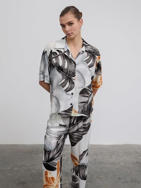– czysta wiskoza- kołnierz: kent- dekolt: V- zapięcie: listwa guzikowa- długość rękawa: półdługi- krój: luźny- wzór: na całościUwaga: Przy wyborze właściwego wariantu zaleca się korzystanie z tabeli rozmiarów.