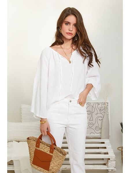 – czysty len- dekolt: V- krój: luźny- look: jednokolorowy