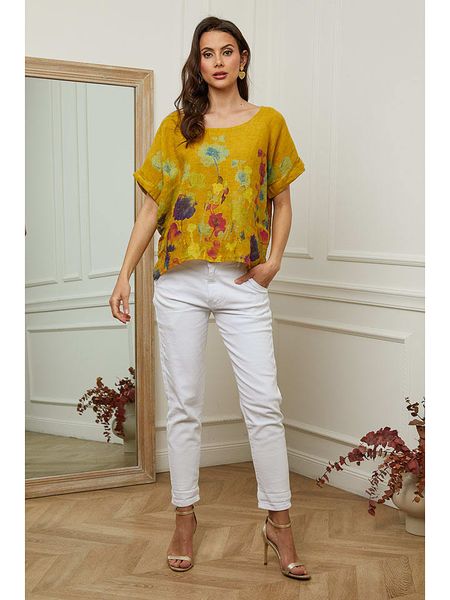 – czysty len- dekolt: okrągły- krój rękawów: nietoperz- krój: luźny- wzór: kwiatowy