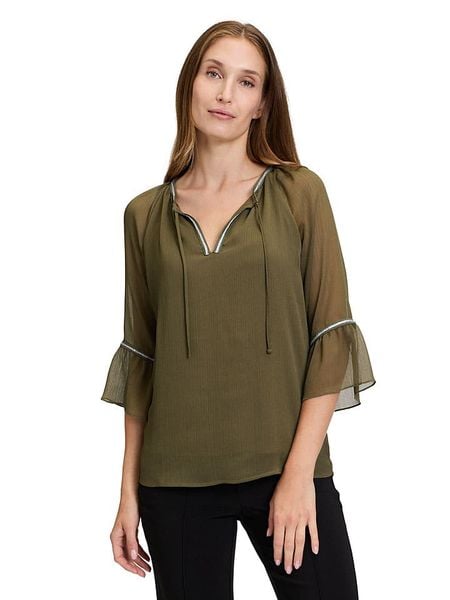 – dekolt: z rozcięciem- krój rękawów: rozszerzany do dołu- długość rękawa: 3/4- detale: aplikacje- krój: prosty- look: jednokolorowy