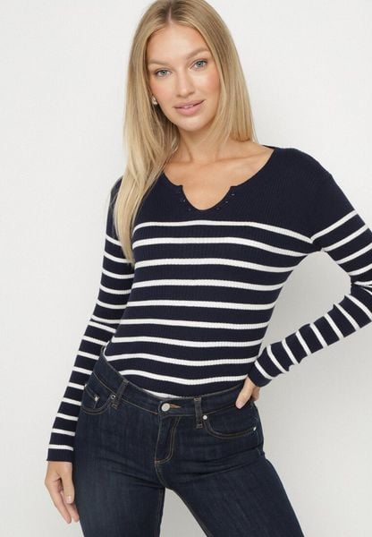 Granatowa Bluzka z Bawełną w Paski Ozdobiona Guzikami Gelvila