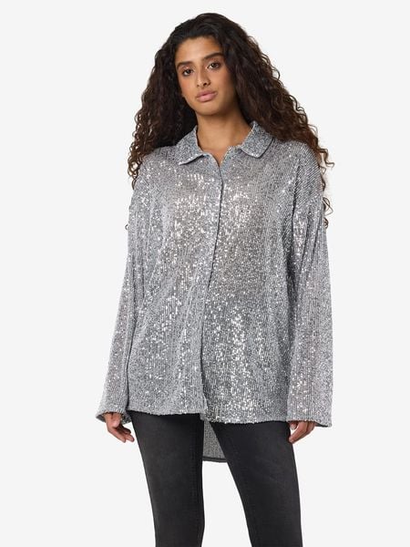 – kołnierz: kent- zapięcie: listwa guzikowa- krój rękawów: rozszerzany do dołu- dolny brzeg: zaokrąglony- detale: cekiny- krój: luźny- look: jednokolorowy