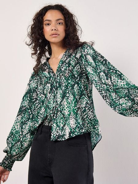 – dekolt: V- zapięcie: listwa guzikowa- krój rękawów: bufiasty- zakończenie rękawów: marszczenie- dolny brzeg: zaokrąglony- krój: luźny- wzór: na całości