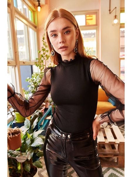 – kołnierz: stójka- zapięcie: guzik na plecach- detale: tiul- krój: wąski- look: jednokolorowy