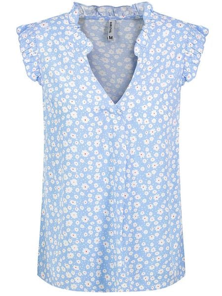 Niebiesko-Biała Koszulowa Bluzka z Wiskozy w Roślinny Wzór z Dekoltem w Serek Koladoretia