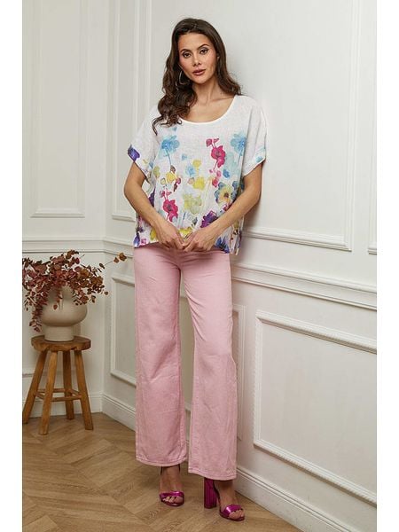 – czysty len- dekolt: okrągły- krój rękawów: nietoperz- krój: luźny- wzór: kwiatowy
