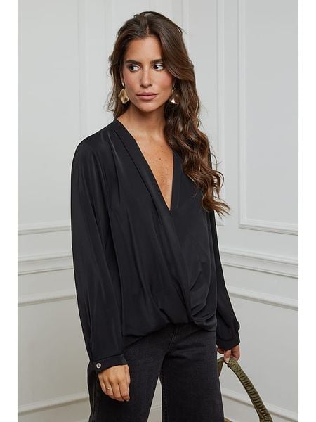 Czarna Bluzka Satynowa z Długim Rękawem i Dekoltem w Serek Ozdobiona Cyrkoniami Yontia