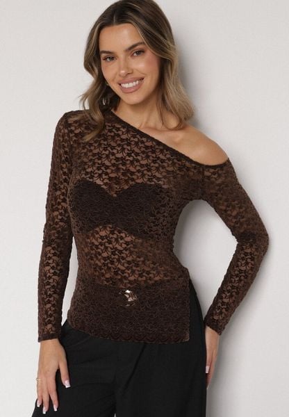 Brązowa Koronkowa Bluzka z Długim Rękawem i Asymetrycznym Dekoltem Liwedara