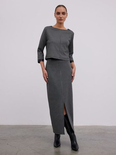 – dekolt: łódka- długość rękawa: 3/4- detale: wstawki ze skóry syntetycznej- krój: prosty- wzór: pepitka