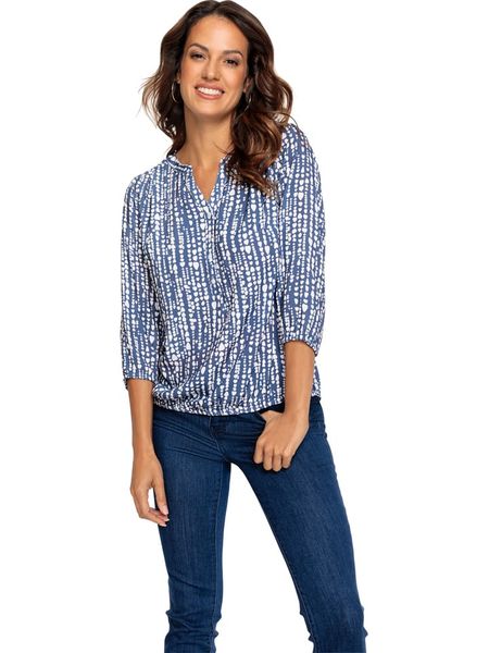 – czysta wiskoza- dekolt: V- zapięcie: skrócona listwa guzikowa- zakończenia rękawów: elastyczne- długość rękawa: 7/8- krój: prosty- dolny brzeg: elastyczny- wzór: na całości