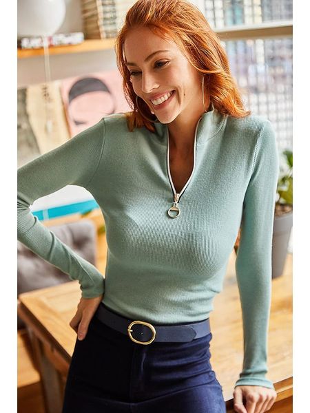 – kołnierz: stójka- zapięcie: skrócony zamek błyskawiczny- look: jednokolorowy, prążkowany- krój: prosty