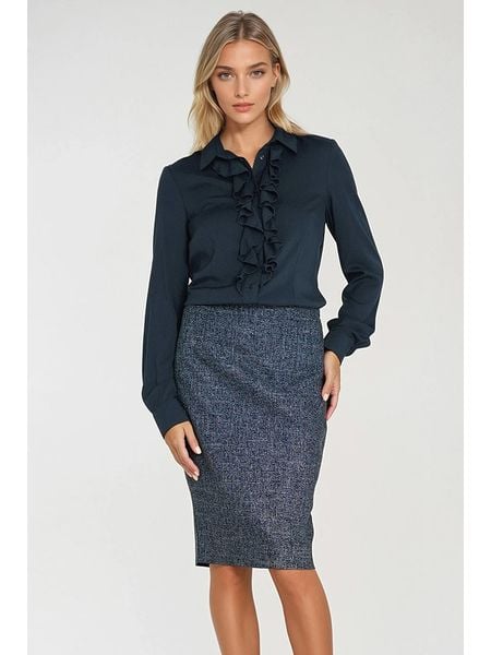 – kołnierz: kent- zapięcie: listwa guzikowa- zakończenie rękawów: mankiet na guzik- detale: falbany- krój: prosty- look: jednokolorowy