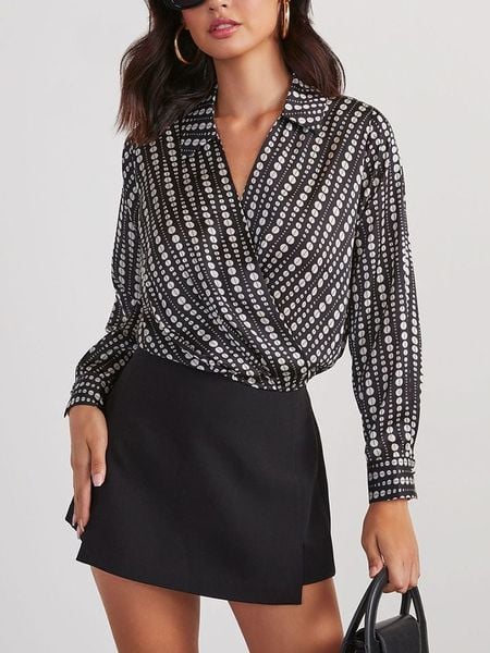 – kołnierz: kent- dekolt: V- zakończenie rękawów: guzik- krój: luźny- wzór: na całości- look: koperta