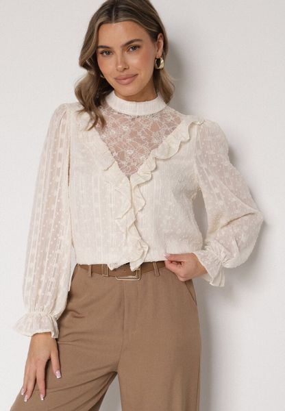 Beżowa Bluzka Zdobiona Koronką Falbankami i Metaliczną Nicią Feralea
