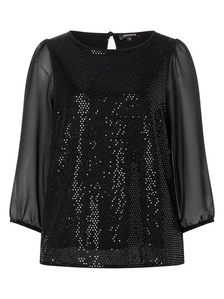 – dekolt: okrągły- zapięcie: guzik na plecach- długość rękawa: 3/4- detale: cekiny- krój: luźny- look: jednokolorowy- wykończenie: delikatnie prześwitujące
