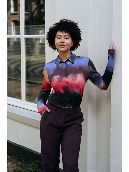 – kołnierz: kent- zapięcie: listwa guzikowa- dolny brzeg: zaokrąglony- krój: taliowany- wzór: przejście kolorów