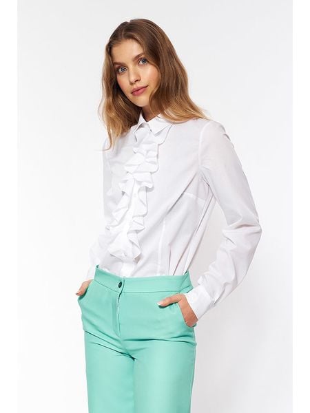 – z dodatkiem bawełny- kołnierz: kent- zapięcie: listwa guzikowa- zakończenie rękawów: mankiet na guzik- detale: falbany- krój: prosty- look: jednokolorowy