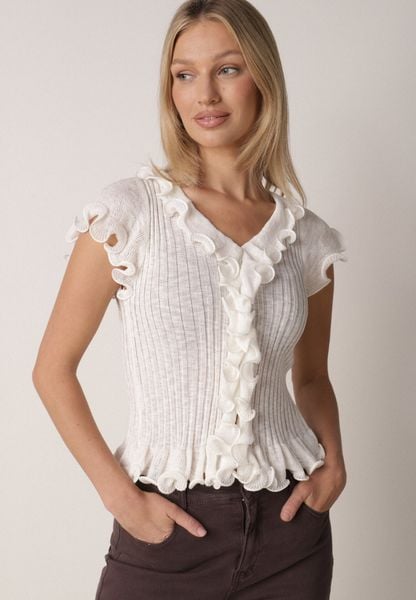 Biała Prążkowana Bluzka z Wiskozą Ozdobiona Falbanami Delestra