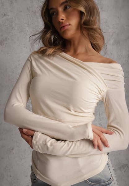 Beżowa Marszczona Bluzka z Bawełną i Dekoltem w Łódkę Orinlia