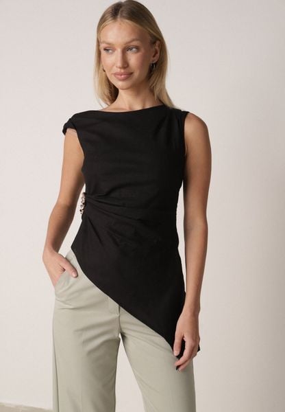 Czarna Bawełniana Bluzka o Asymetrycznym Marszczonym Kroju z Aplikacją Omphasia