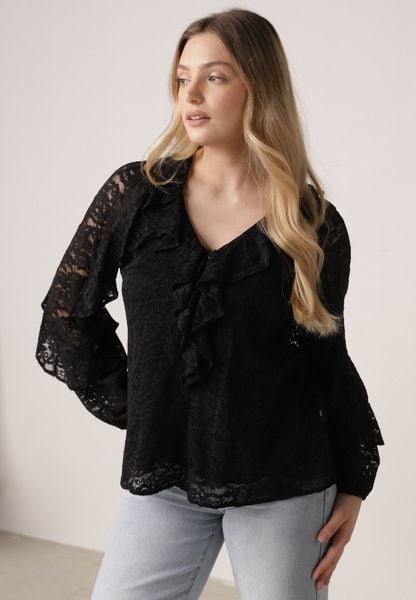 Czarna Bluzka z Koronki Ozdobiona Falbankami Sewola