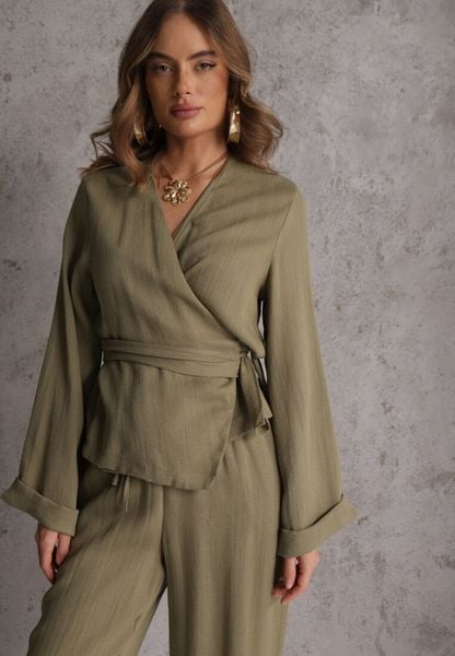 Zielona Wiskozowa Bluzka z Kopertowym Dekoltem i Wiązaniem z Boku Velarila