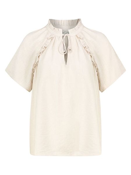 – kołnierz: stójka- dekolt: z rozcięciem- detale: falbanki, ozdobne wiązanie- krój: prosty- look: jednokolorowy