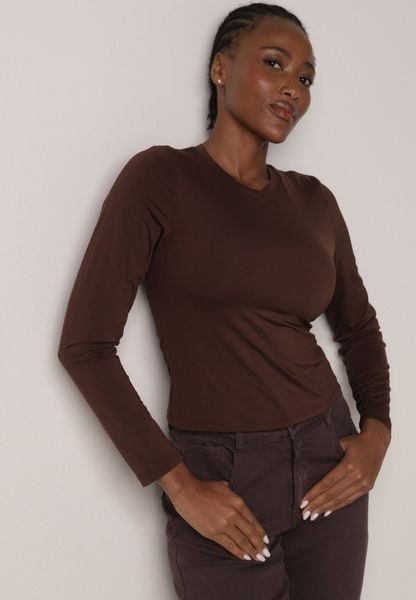 Brązowa Gładka Bluzka z Długim Rękawem z Bawełną Moaneta