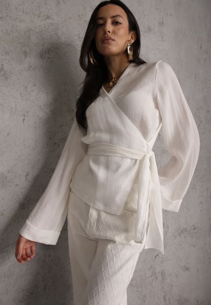 Biała Wiskozowa Bluzka z Kopertowym Dekoltem i Wiązaniem z Boku Velarila