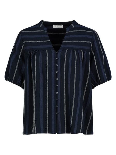 – z dodatkiem lnu- kołnierz: stójka- dekolt: z rozcięciem- zapięcie: listwa guzikowa- zakończenie rękawów: elastyczne- krój: luźny- wzór: paski