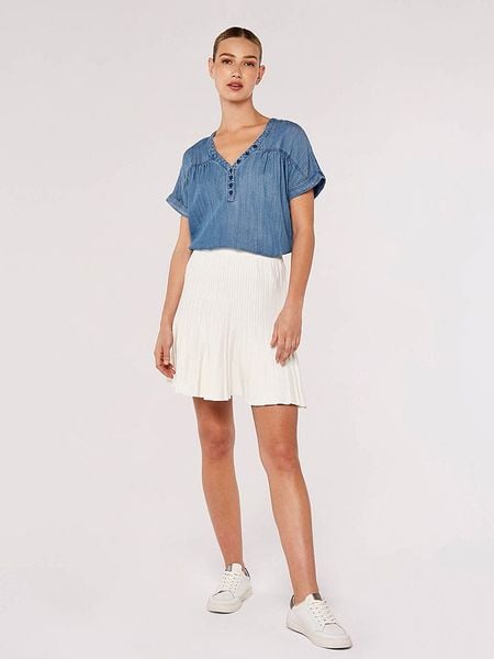 – czysty lyocell- dekolt: V- zapięcie: skrócona listwa guzikowa- dolny brzeg: zaokrąglony- krój: prosty- przetarcia: tak- look: stylizowany na dżins
