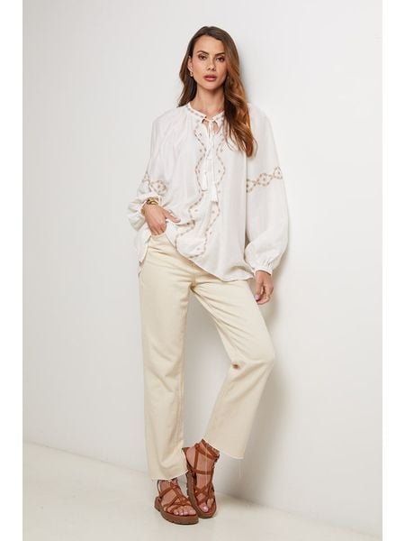 – z dodatkiem lnu- z dodatkiem wiskozy- dekolt: z rozcięciem- zakończenie rękawów: elastyczne- detale: ozdobne tasiemki, haft- look: jednokolorowy- krój: luźnyWskazówka: Na metkach odzieży tej marki znajdują się rozmiary francuskie. Rozmiarówka została przez nas przeliczona. Podane do wyboru warianty rozmiarów odpowiadają standardowym europejskim rozmiarom konfekcji. Prosimy zapoznać się z zamieszczonym objaśnieniem rozmiarów.