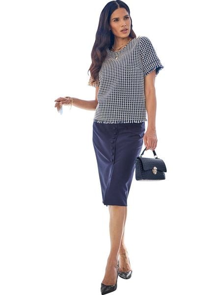 – dekolt: okrągły- detale: dekoracyjne guziczki, frędzle- krój: luźny- wzór: pepitka